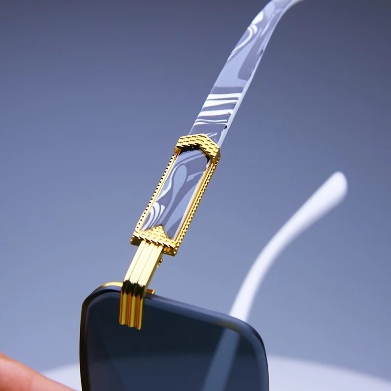Baroque art meets modern design in these statement sunglasses. They feature side arms detailed with black-and-white marbled inlay and sculpted gold trim that nods to gothic architecture. Available in deep black, clear, or a warm gradient lens, each frame is finished with high-gloss edges and crisp lines. These aren’t just glasses—they’re wearable art!
